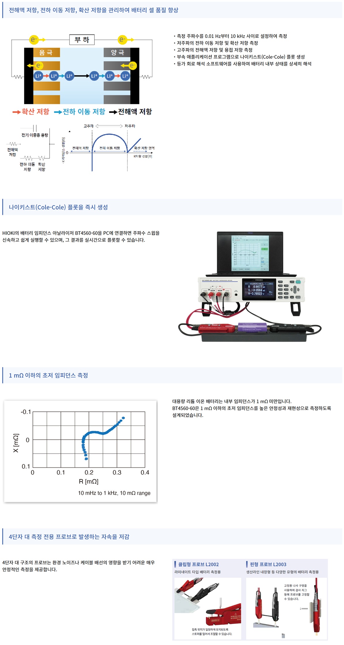 - 배터리 임피던스 미터 BT4560-60은 연구 개발부터 생산 라인까지 신속하고 간편하게 EIS (*1) 측정이 가능합니다. BT4560-60은 0.01 Hz~10 kHz의 넓은 EIS 측정 주파수 범위를 지원하므로 특히 셀 설계 연구 개발에 최적입니다.