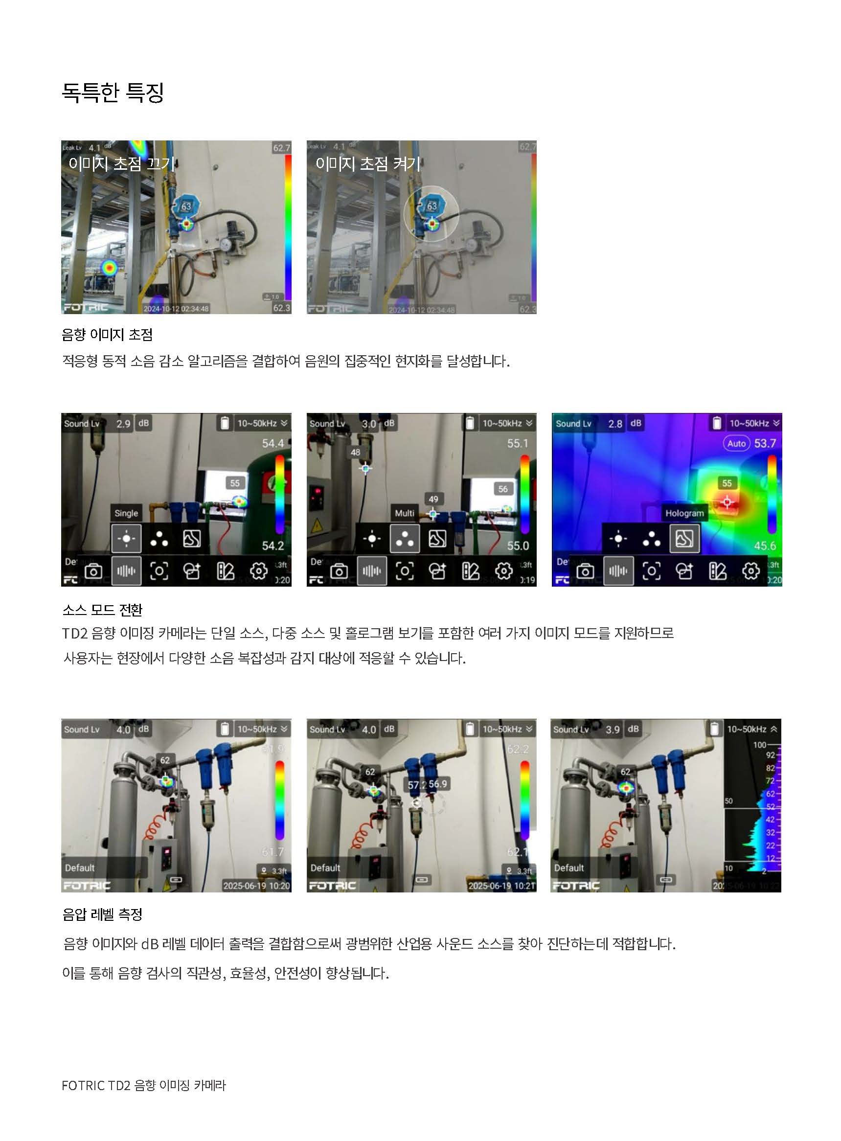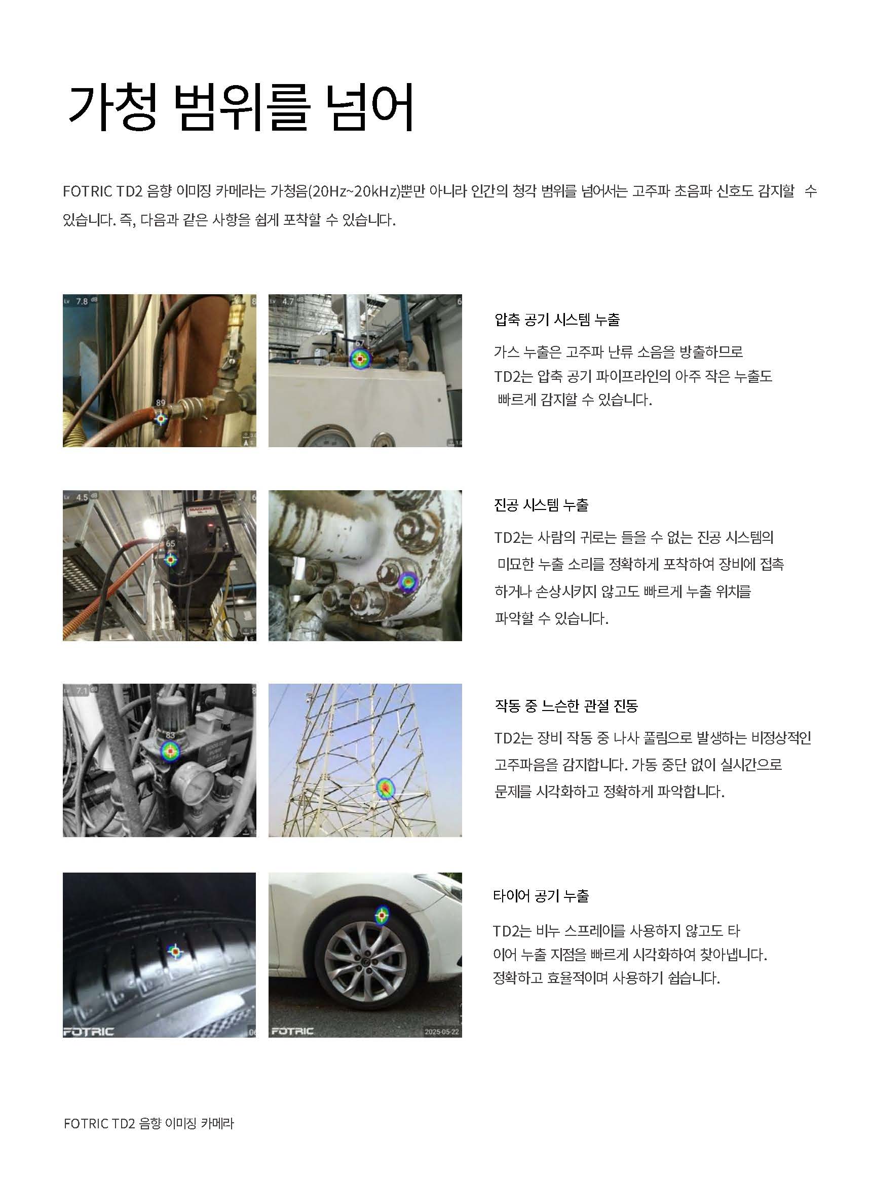 음파카메라 (음향이미저) TD2 공기압축누기 검출 고전압설비의 부분방전 검출 기계 및 모터의 불량 진동 탐지 제조사 FOTRIC 제품명 음파카메라 (음향이미저) TD2 제품번호 TD2 구매하기 견적문의 ※ 제품 구성품 (소프트케이스 무상 제공) TD2 데이터시트 확장자 : pdf 파일크기 : 1.64MB 다운로드 목록