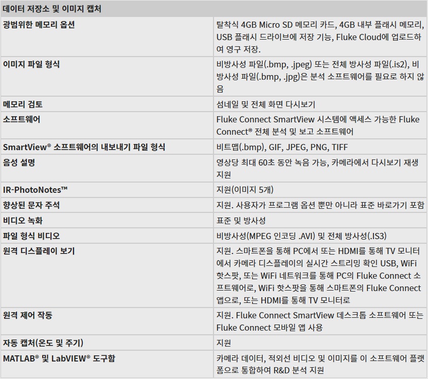 열화상카메라 240도 회전 접이식 화면 과 640 x 480 고해상도 열화상카메라 640 x 480 Pixel 열화상 해상도 240도 회전 접이식 화면 -20°C ~ 800°C 광대역 온도 측정 제조사 FLUKE 제품명 열화상카메라 제품번호 Tix580 구매하기 견적문의 5.7인치 화면으로 표준 3.5인치 화면보다 150% 더 넓어진 보기 영역을 제공합니다.240도 회전 화면으로 인해 촬영 유연성이 탁월합니다.인체 공학적 설계와 넥 스트랩으로 장기간의 검사일 동안에도 더욱 편리하게 사용 가능합니다.LaserSharp® Auto Focus는 지정된 대상과의 거리를 정확하게 ="1" 계산합니다.MultiSharp™ Focus는 시야각 전체에서 이미지 초점을 자동으로 맞춰 오진 가능성을 획기적으로 줄여줍니다.IR Fusion® 기술을 사용하면 가시 이미지와 적외선 이미지 혼합을 쉽게 조정할 수 있습니다.Fluke Connect®는 무선 테스트 및 측정 도구로 이루어진 Fluke 네트워크에 카메라를 연결합니다.여러 이미지를 캡처하고 결합하여 1280 x 960 이미지를 생성하는 SuperResolution으로 픽셀 데이터를 4배 더 확보하십시오.두 가지 유용한 기능을 사용하여 현장에서 메모할 필요성을 줄여줍니다. [데이터시트]Ti401PRO, Ti480PRO, TiX501, TiX580.pdf 확장자 : pdf 파일크기 : 2.80MB 다운로드 목록