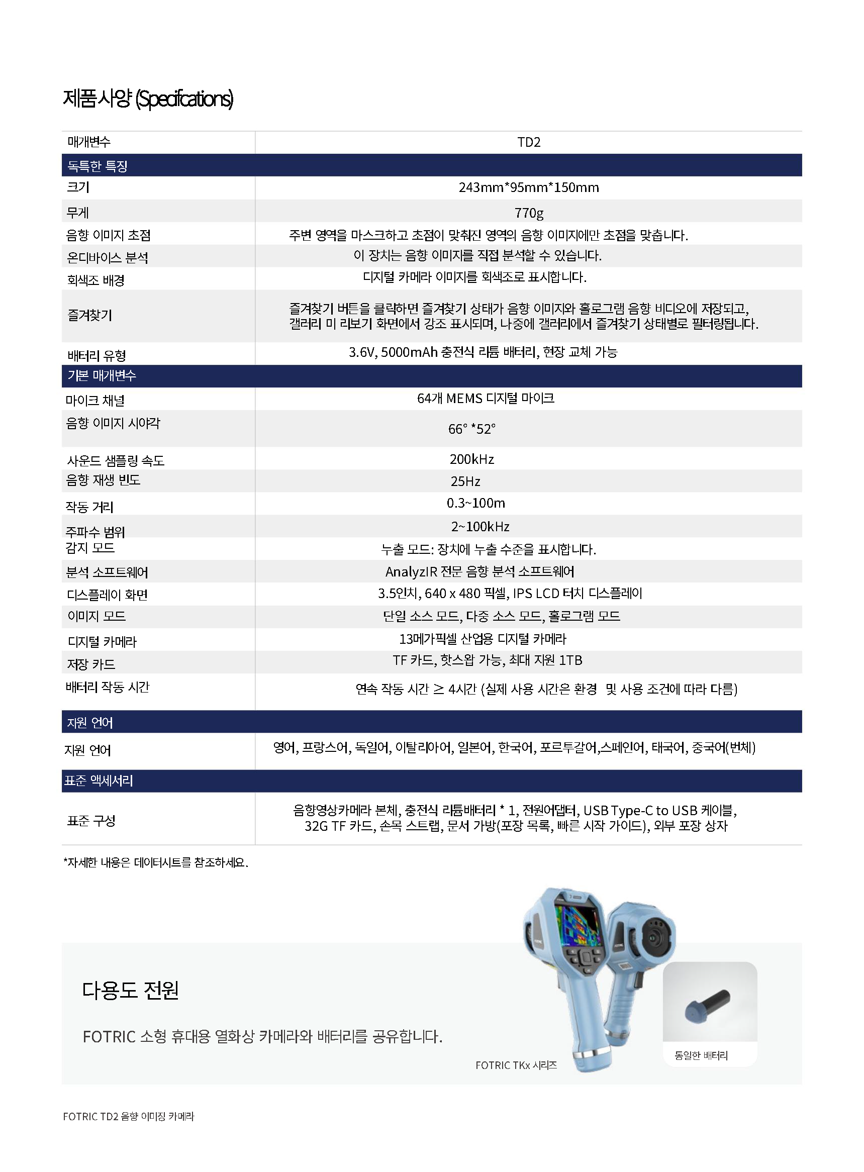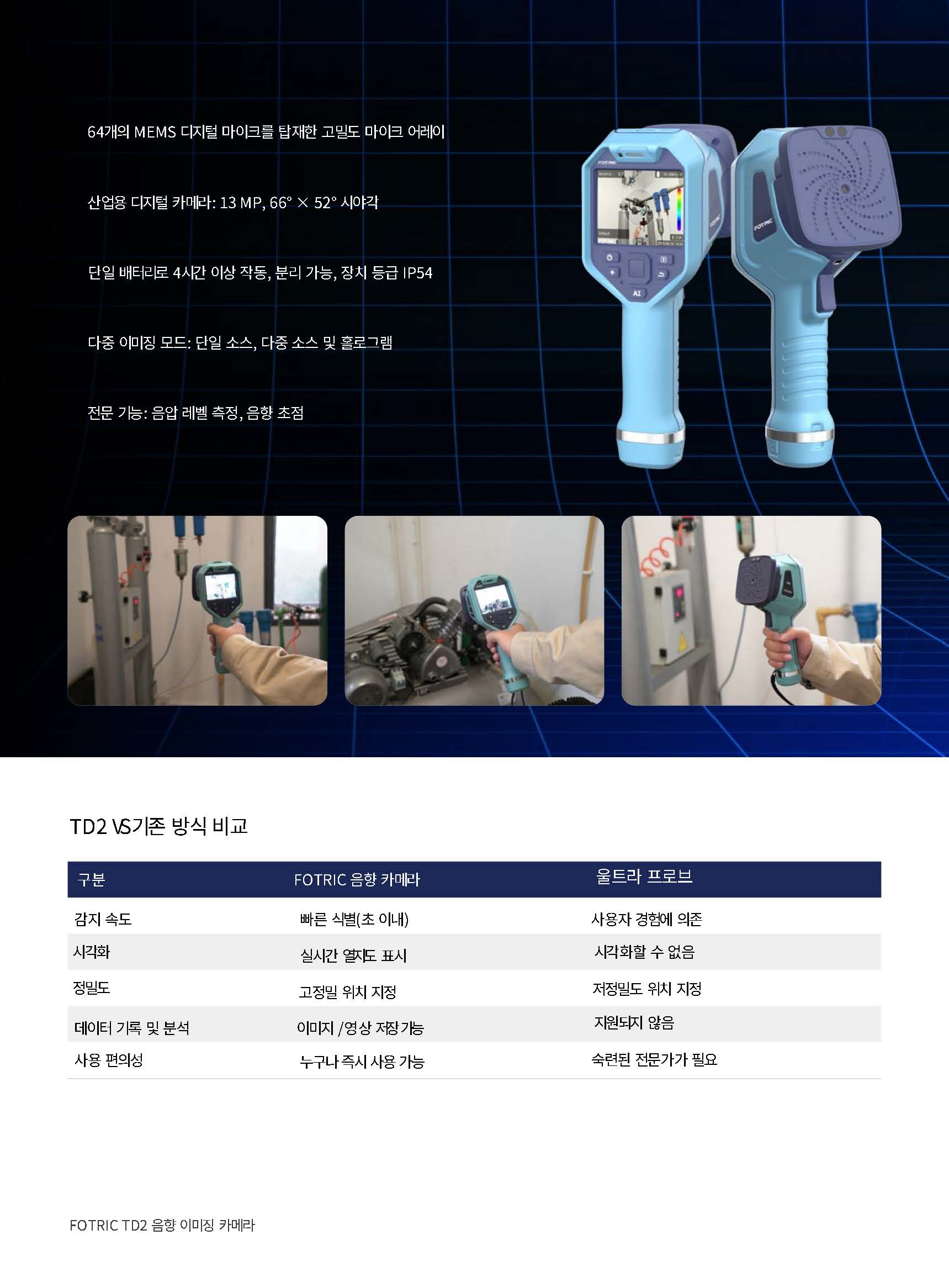 음파카메라 (음향이미저) TD2 공기압축누기 검출 고전압설비의 부분방전 검출 기계 및 모터의 불량 진동 탐지 제조사 FOTRIC 제품명 음파카메라 (음향이미저) TD2 제품번호 TD2 구매하기 견적문의 ※ 제품 구성품 (소프트케이스 무상 제공) TD2 데이터시트 확장자 : pdf 파일크기 : 1.64MB 다운로드 목록